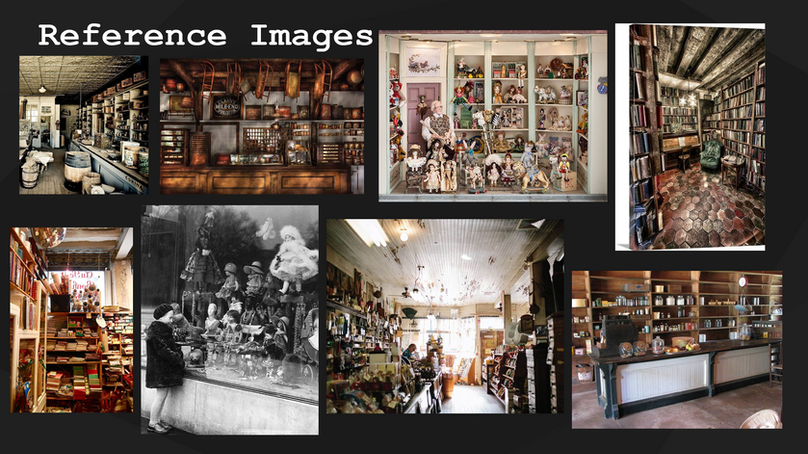 The concept that I went with was one of an abandoned toy shop. The toys and games used in the scene are based off of toys from around the 1920s-1930s era.
